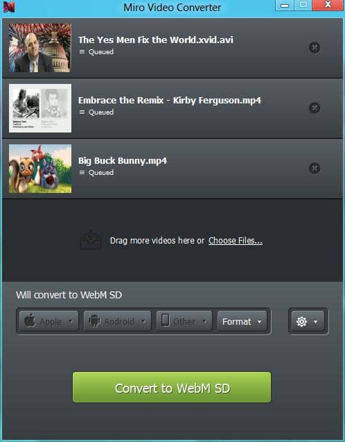 Miro Video Converter for Mac is another free Mac video converter which can convert videos to the major formats like AVI, MP4, FLV, etc. and a wide range of mobile devices, like iPhone, Android and PlayStation Portable, etc. It can extract audio from a video file but can only output MP3 audio file. Indeed, there are no so many preset output formats and advanced options and tools that those paid applications have, but its simplicity makes it really easy-to-use and a great program to quickly convert video files.