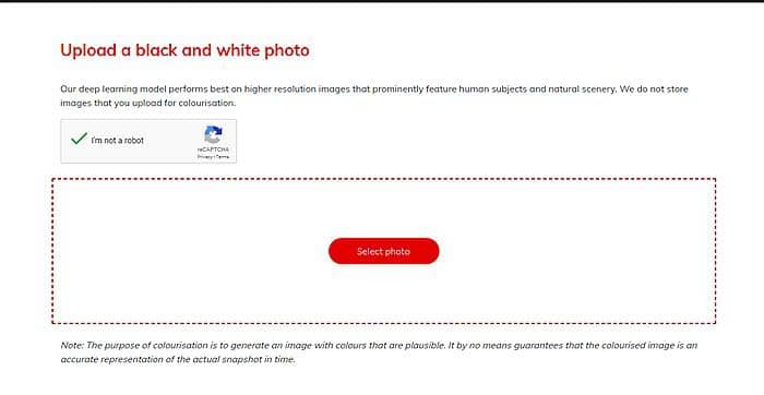 ColouriseSG uses a deep learning colorizer prototype specifically for old Singapore photos. Before using this online photo colorization tool, you are required to verify the captcha first. Only after the checking, you can upload your old black and white photos.