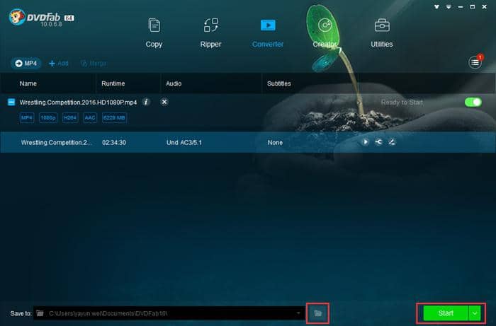 Click the “folder” icon at the bottom to select a directory to save the output video. And then you can click the “Start” button to start the process of MP4 video compression.