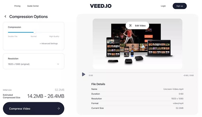 If you want to compress MP4 video to a smaller size online for free then this online service is best for you. If you do not want to download or use a tool on your own PC, this online service or app will allow you to upload a video file and compress it for you. As part of their video editing services, VEED provides a simple-to-use video compression feature to lower video file size for free. It works with both Mac and Windows, and within your browser, so there is no need to download any specific software separately.