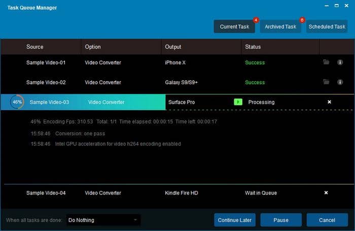 Step 4 — Once the conversion process is triggered, users not only can monitor the progress status of each conversion task, but can also pause and resume any task at any time when necessary.