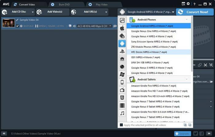 Any Video Converter — as a freeware, this video converter software converts video files of different formats into compatible formats ready to play on smart phones and tablet computers running Android. The supported input video formats includes DivX, XviD, MOV, RM, RMVB, MPEG, VOB, DVD, WMV, AVI, MPEG-1, MPEG-2, MPEG-4, 3GP, and FLV, etc. as for the output format, users can choose WMV, MPG, MP4, AVI, ASF, M2TS, 3GP, 3G2, FLV, MKV, SWF, WEBM, HTML5 WEBM, HTML5 OGG, HTML5 MP4 and more. Worth mentioning, this product runs on Windows 2000 SP4, XP, Vista, 7, 8 and 10.